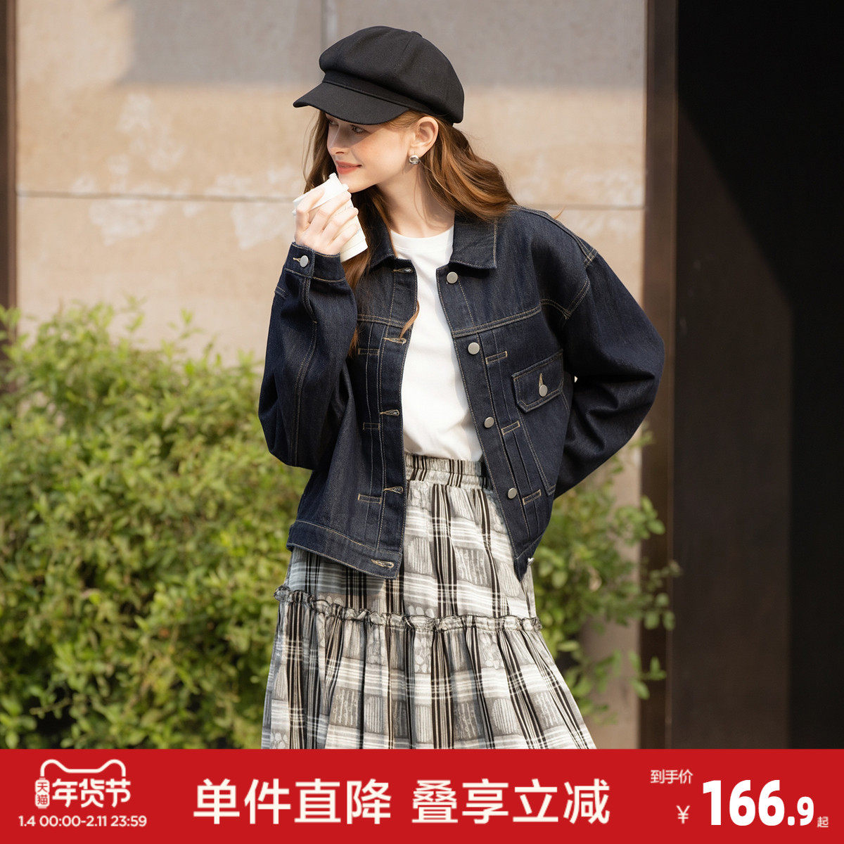 唐狮2026春季新款女牛仔外套短款休闲风落肩款时尚百搭深色牛仔