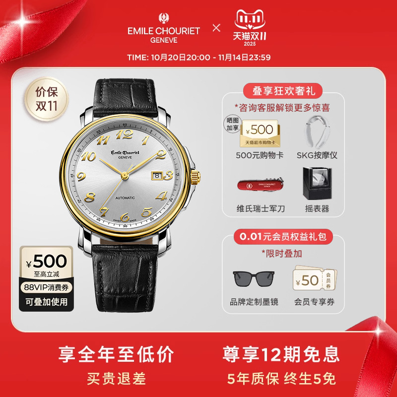 【会员至优价】艾米龙Emile Chouriet莱蒙黑色牛皮带机械手表男
