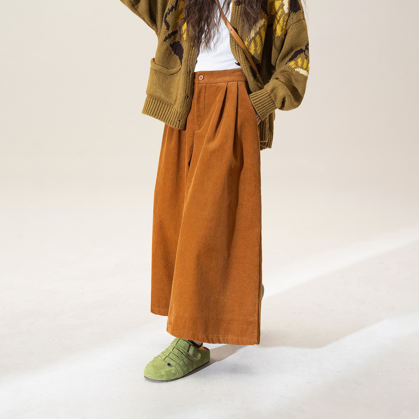 橘色日系复古灯芯绒阔腿裤女冬季新款高腰宽松显瘦加绒七分休闲裤