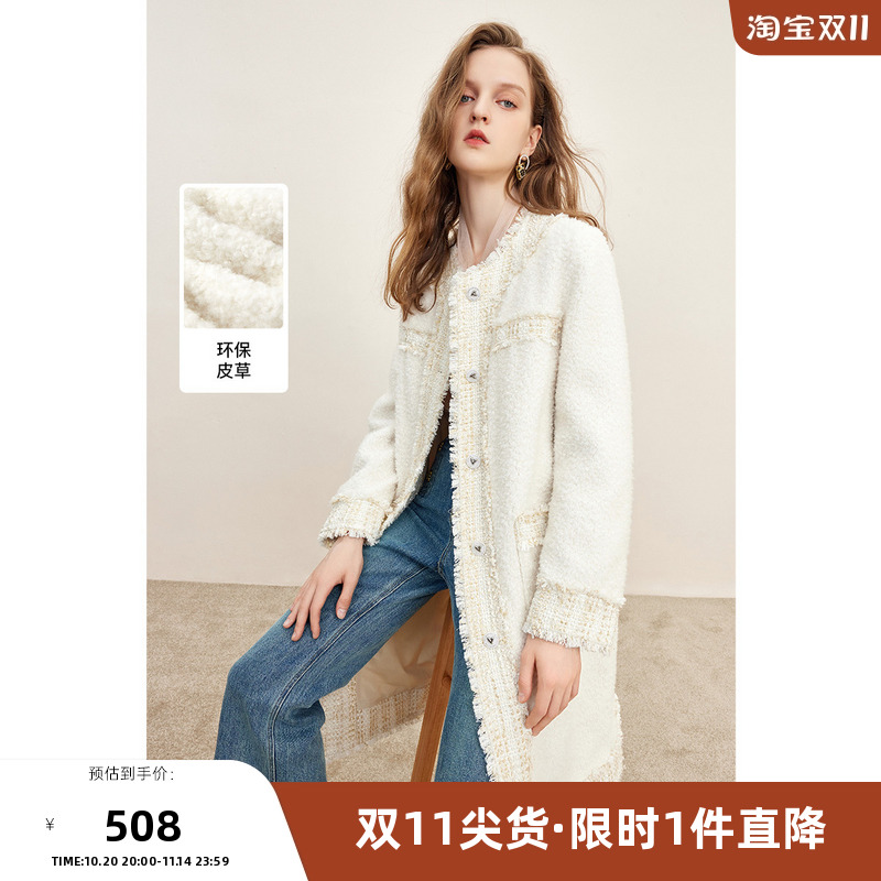 云知2025年新款千金风流苏毛呢外套女长款米白色轻奢保暖羊绒大衣
