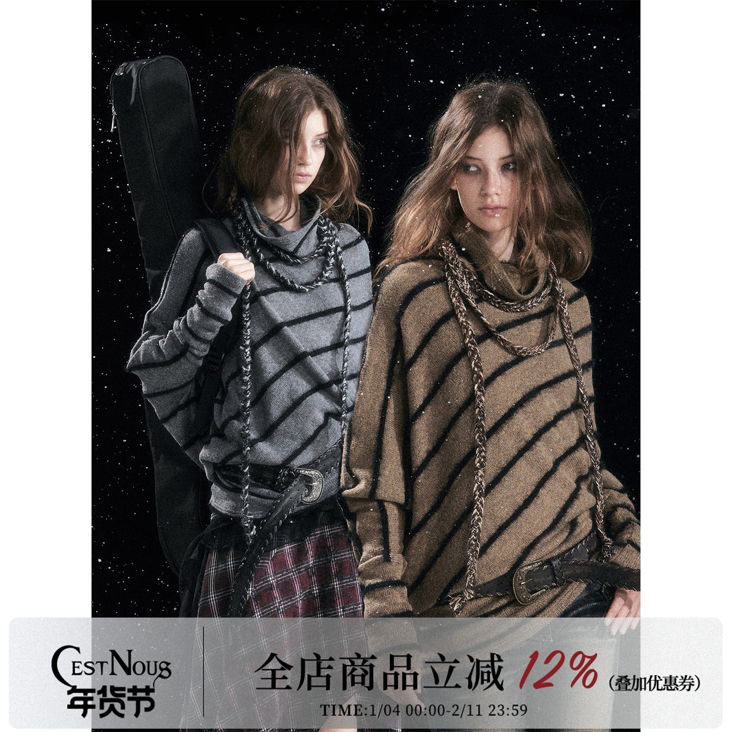 CestNous斜条纹毛衣女冬宽松蝙蝠袖不对称编绳系带慵懒感毛针织衫