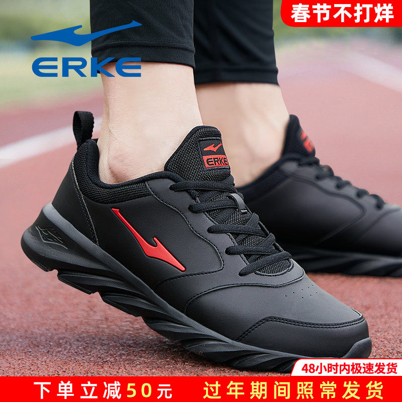 鸿星尔克运动鞋男鞋冬季雨季防水皮面黑色送爸爸父亲中年跑步鞋子