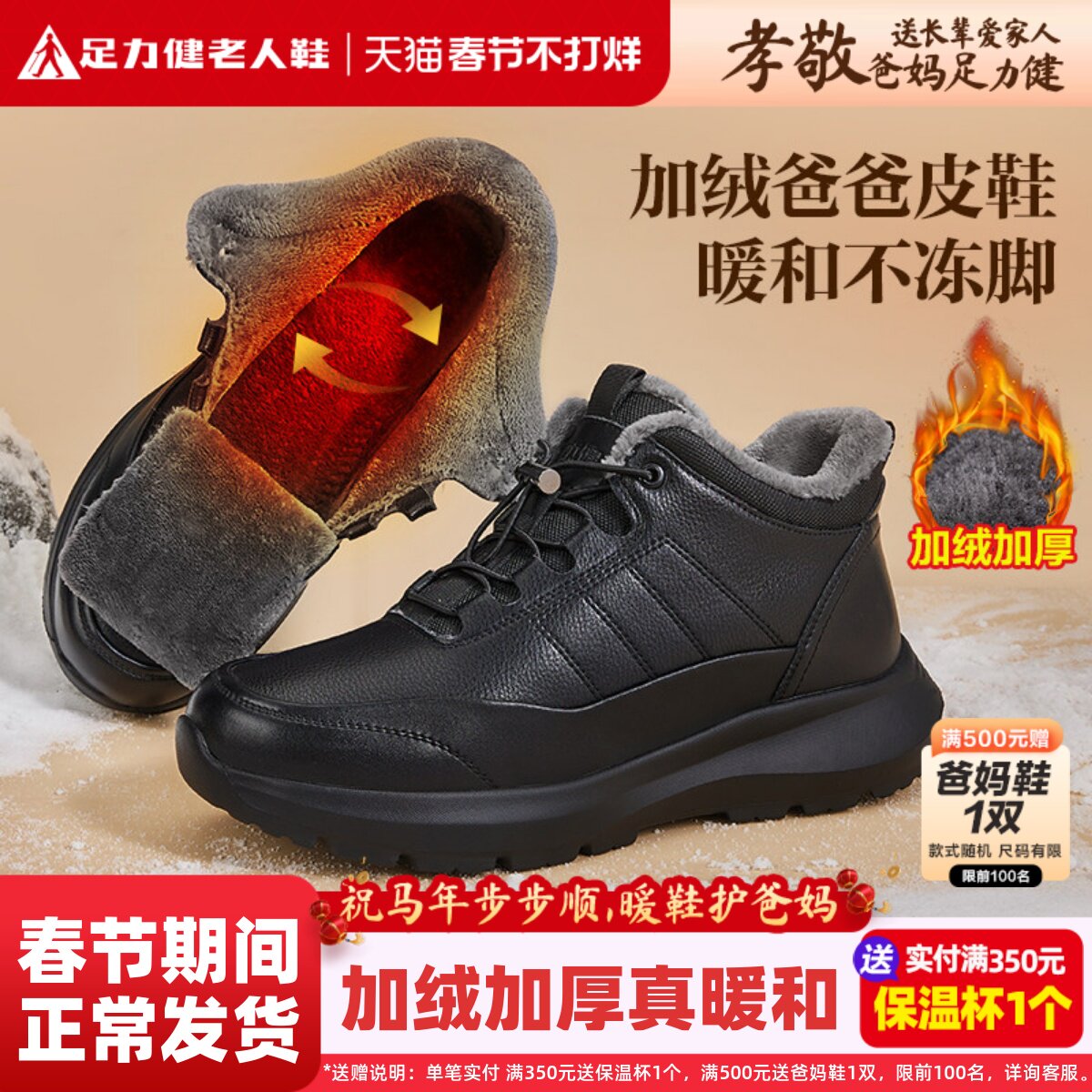 足力健老人鞋男正品冬季加绒皮鞋休闲保暖棉鞋防滑中年舒适爸爸鞋