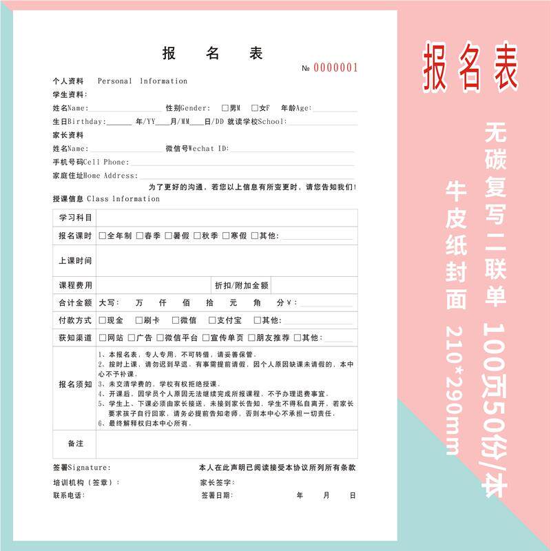 报表定培训教育培训收据16开学校学员登记班表美术艺术舞蹈美制术