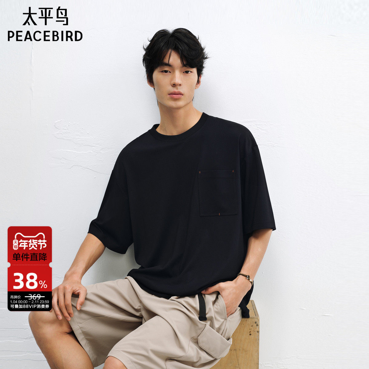 太平鸟男装 黑色短袖t恤男25夏新款重磅工装户外宽松纯色体恤潮