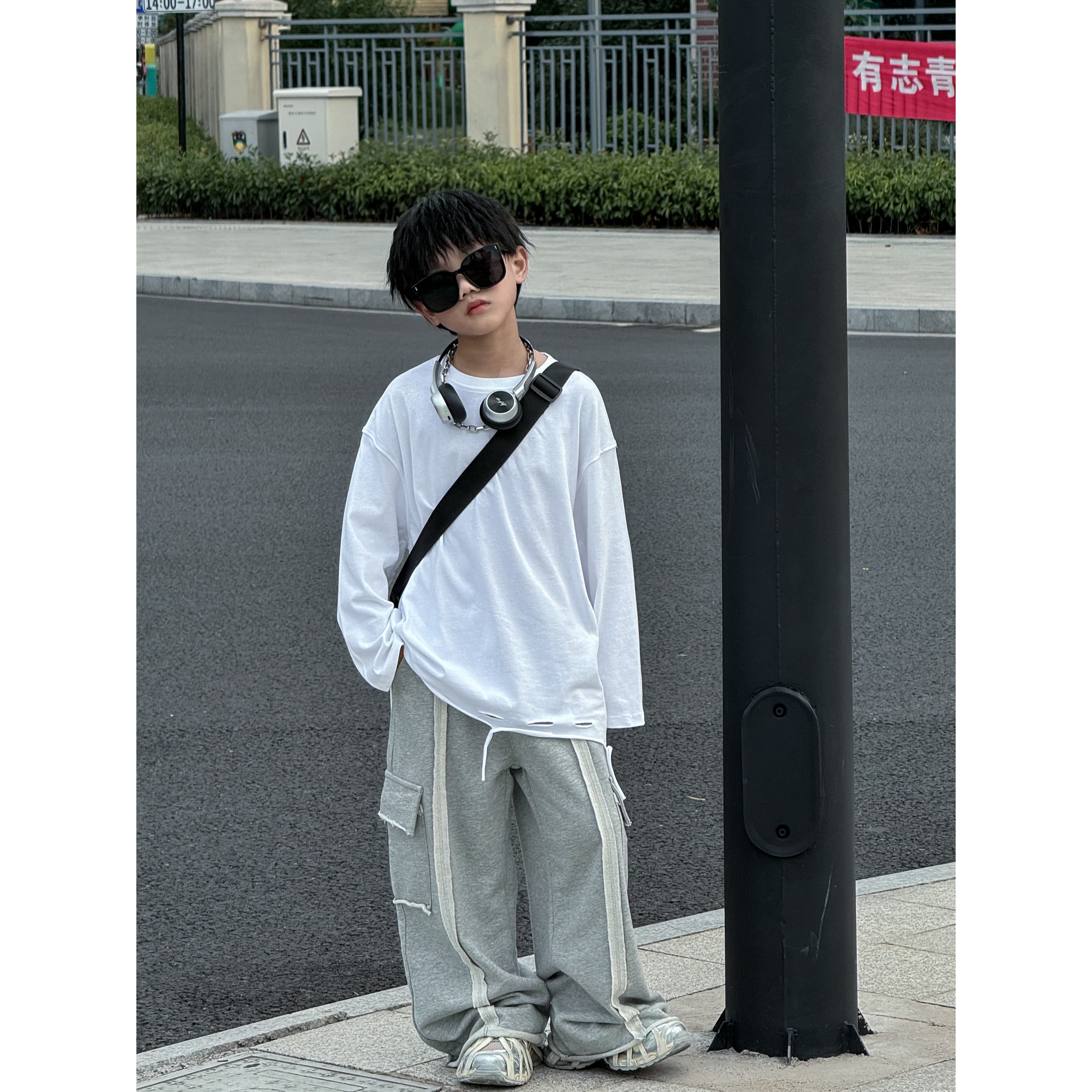 砚台家童装儿童A类纯棉T恤春装中大童黑色长袖上衣小男童纯色体恤