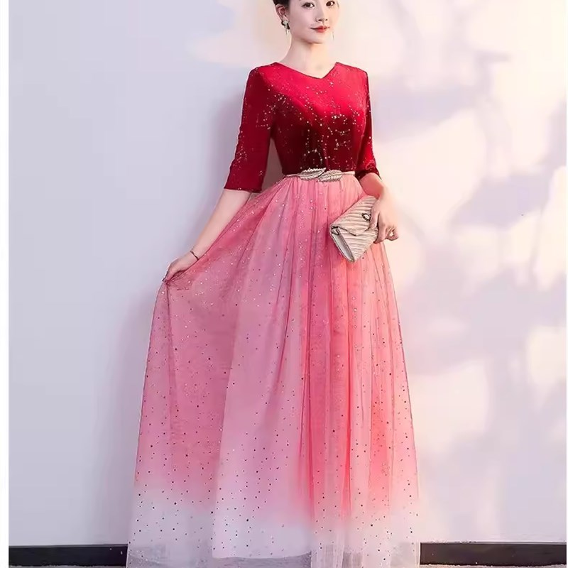 新选合唱礼服女新款演出服成人大合唱长裙红O歌比赛服装连衣裙长