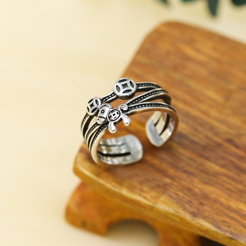 S925银复古马上有钱戒指宽版甜美时尚指环关节食指戒子银饰品女式