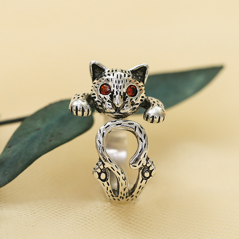 日韩高级感S925纯银猫咪戒指复古动物指环关节食指戒子银饰品女式