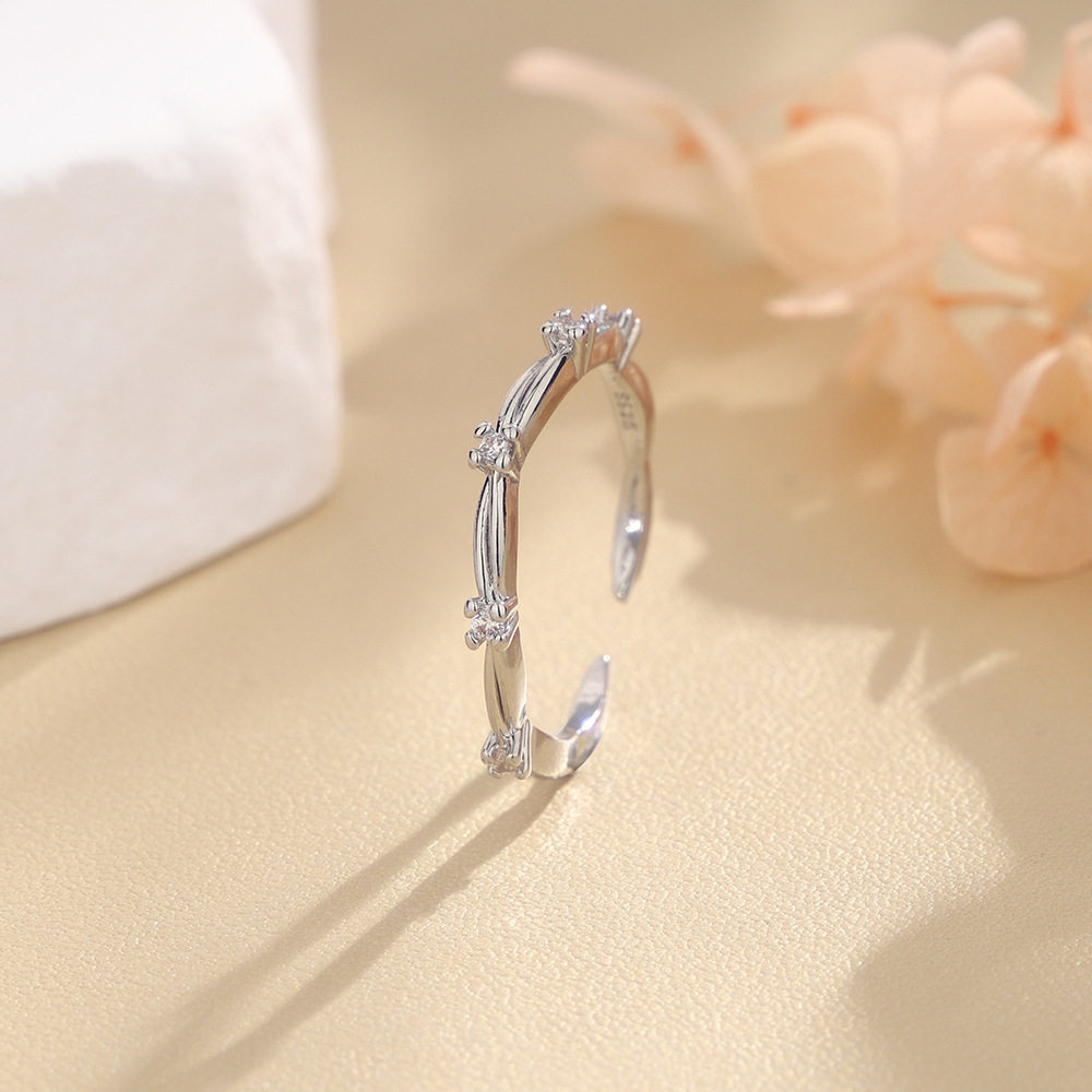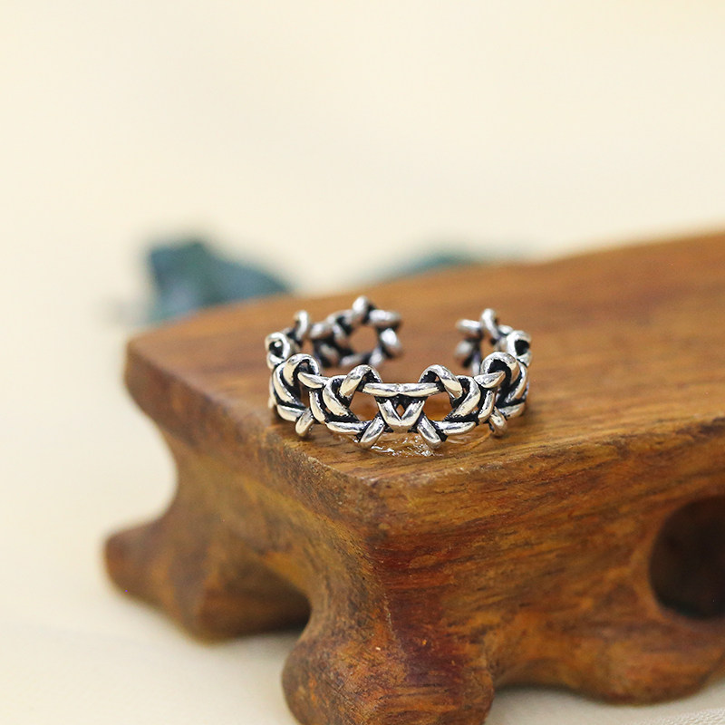 日韩复古交织水钻藏银戒指女士线条波浪关节开口饰品简约扭绳指环