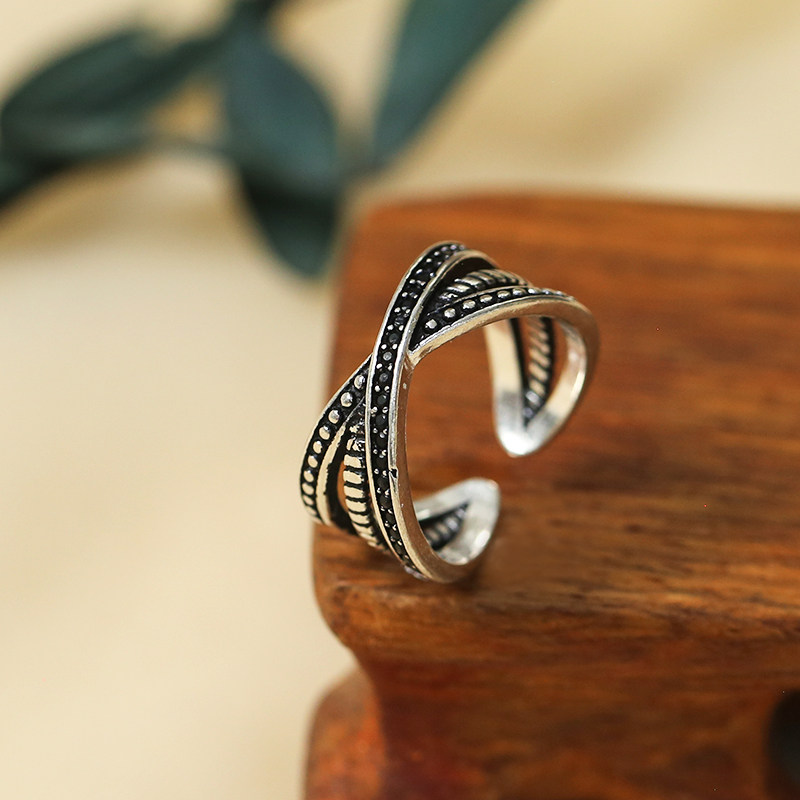 日韩S925银锆石交叉戒指复古多层高级感指环关节食指戒子银饰女式