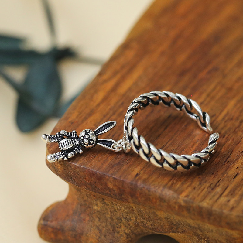 日韩S925银链条兔子戒指高级感复古动物指环关节食指戒子银饰女式
