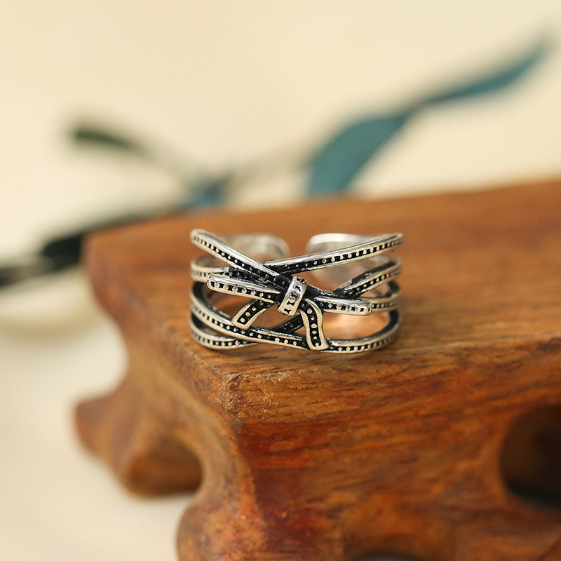 日韩S925银蝴蝶结戒指高级感复古交叉指环关节食指戒子银饰品女式