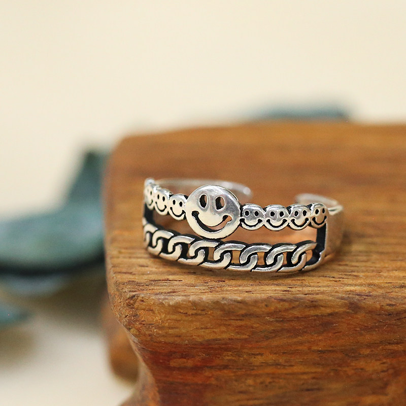 日韩高级感S925纯银微笑戒指笑脸复古银饰品指环关节食指戒子女式