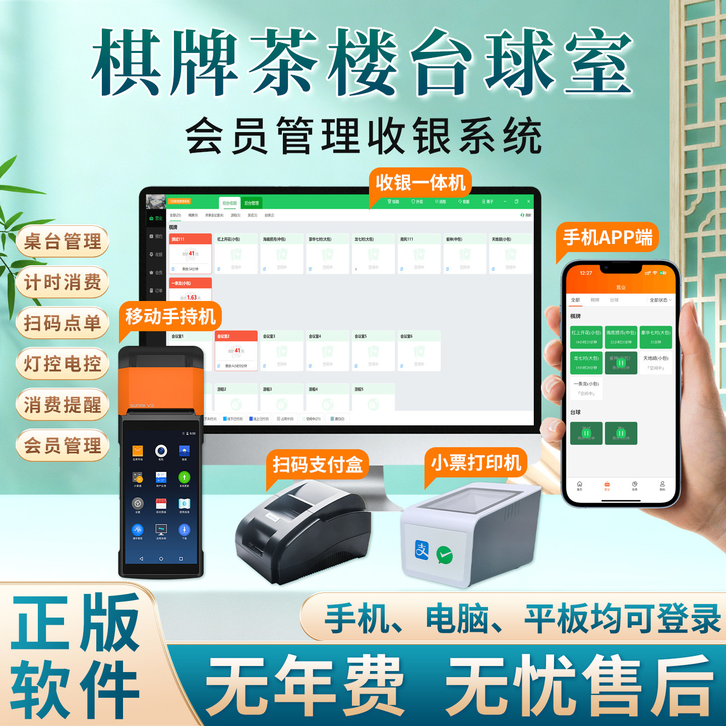 棋牌室收银系统扫码点餐茶楼餐饮台球厅麻将馆桌游剧本杀KTV计时计费收费储值会员管理专用软件一体机