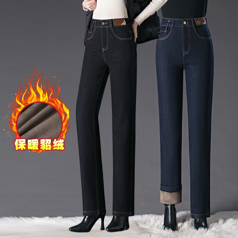 逸阳2025新款女裤秋冬品牌折扣店牛仔裤中年加绒保暖高腰直筒长裤