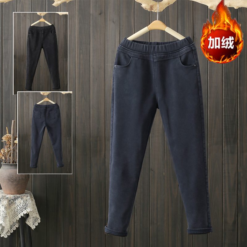 冬季大码女装200斤显瘦女裤加绒加厚仿牛仔小脚松紧腰休闲裤长裤