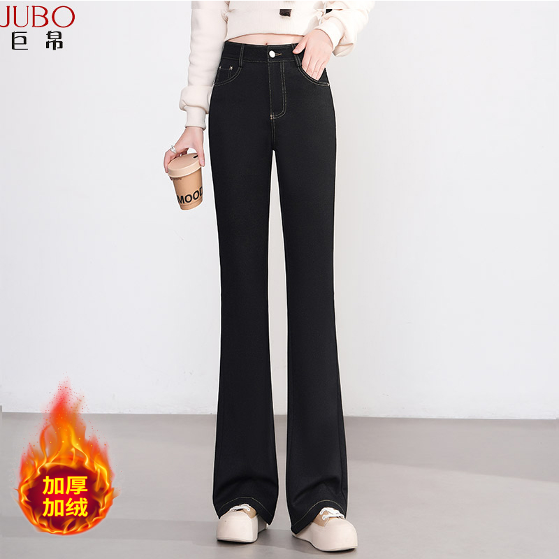 品牌美衣千百惠新款女裤2025秋冬高腰修身加绒百搭鱼尾微喇牛仔裤
