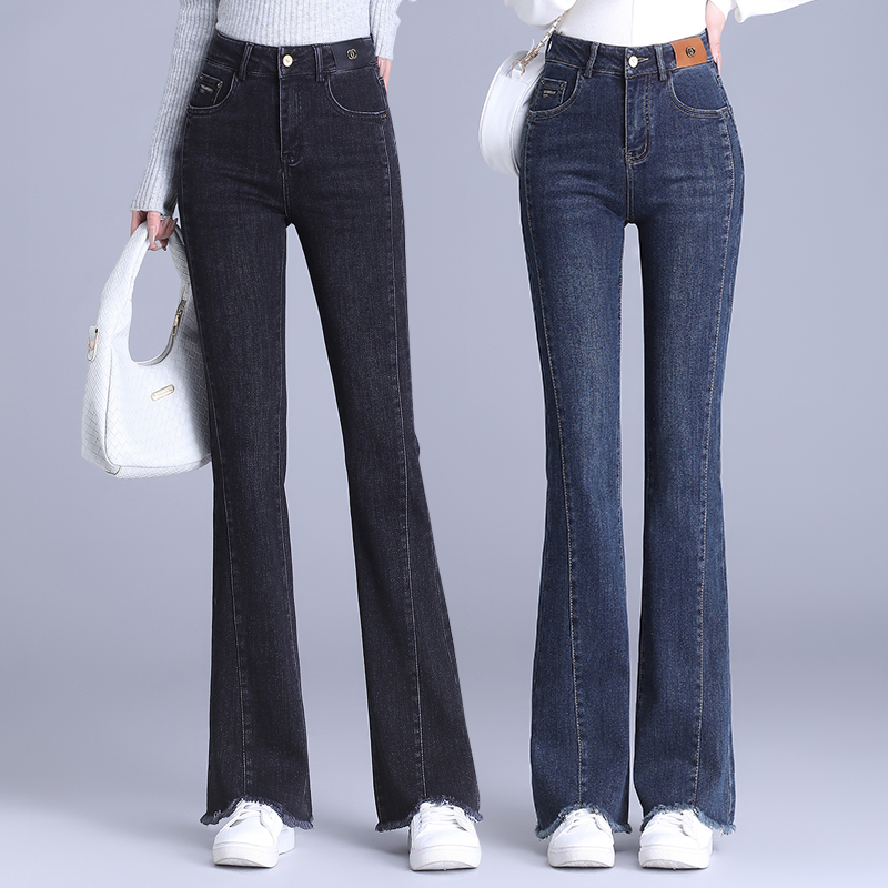 品牌女裤微喇叭牛仔裤女加绒加厚冬毛边高腰显瘦弹力小个子开叉裤
