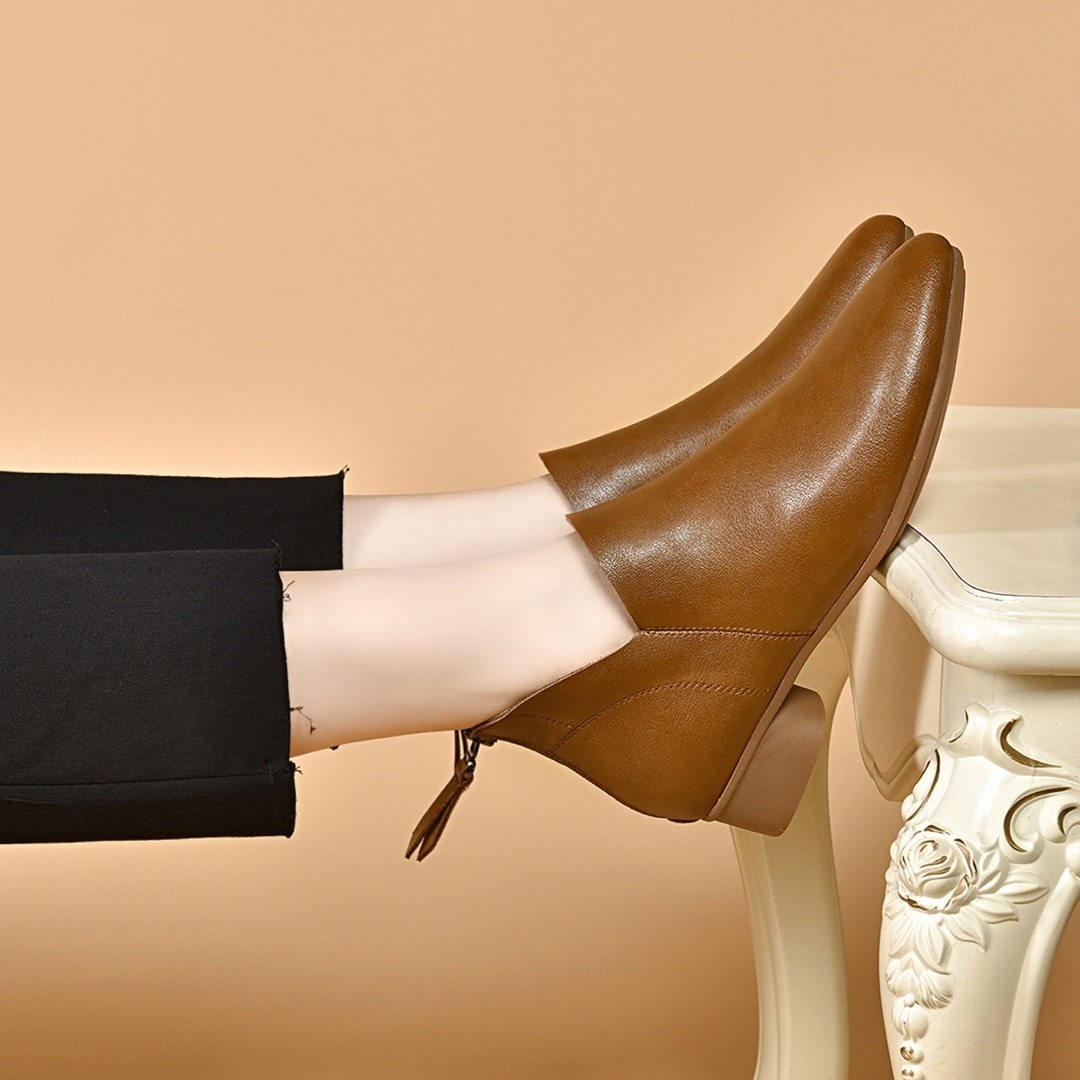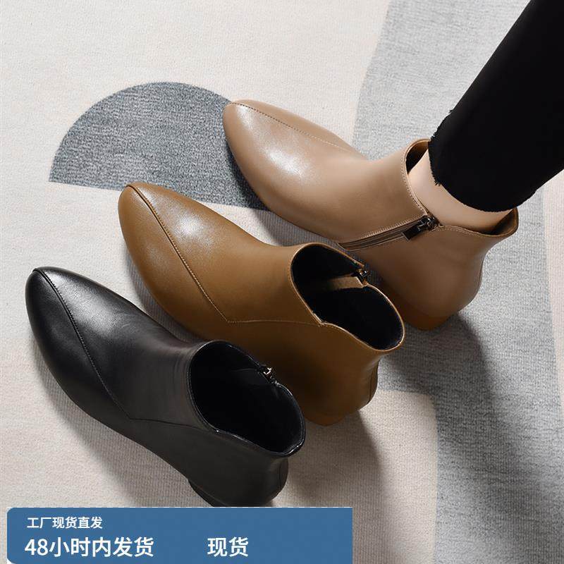 2025新款春秋季女鞋软皮靴子粗跟小短靴及踝靴秋冬女士中跟真皮鞋