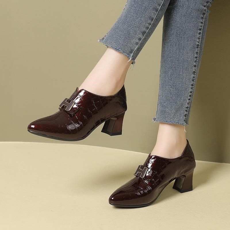 粗跟真皮单鞋女时尚妈妈鞋春秋女鞋深口高跟鞋子及踝靴女士漆皮鞋