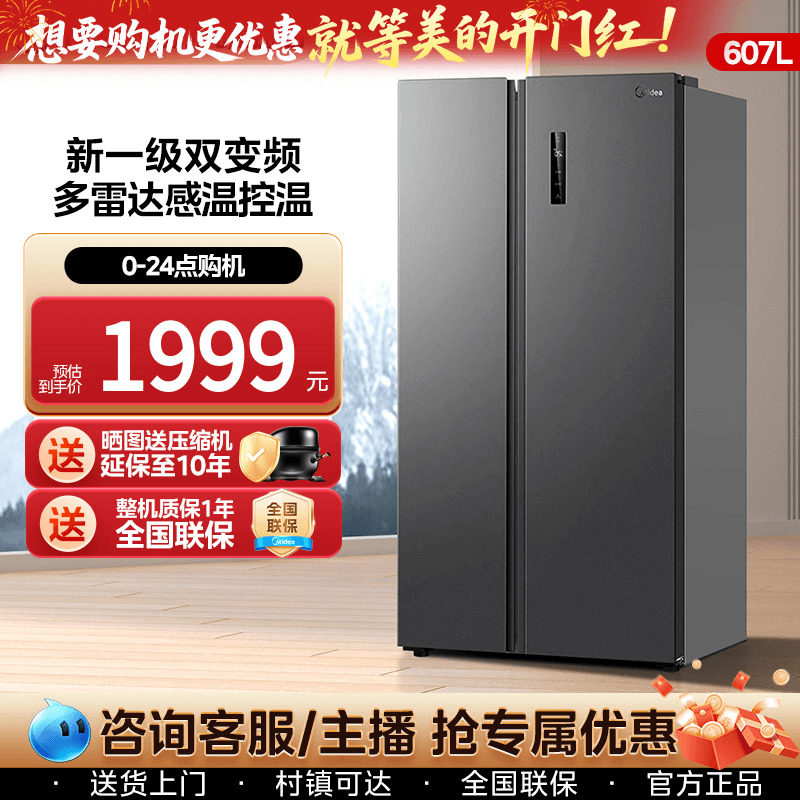 美的607L对开双开门十字大容量风冷无霜家用超薄一级变频606冰箱
