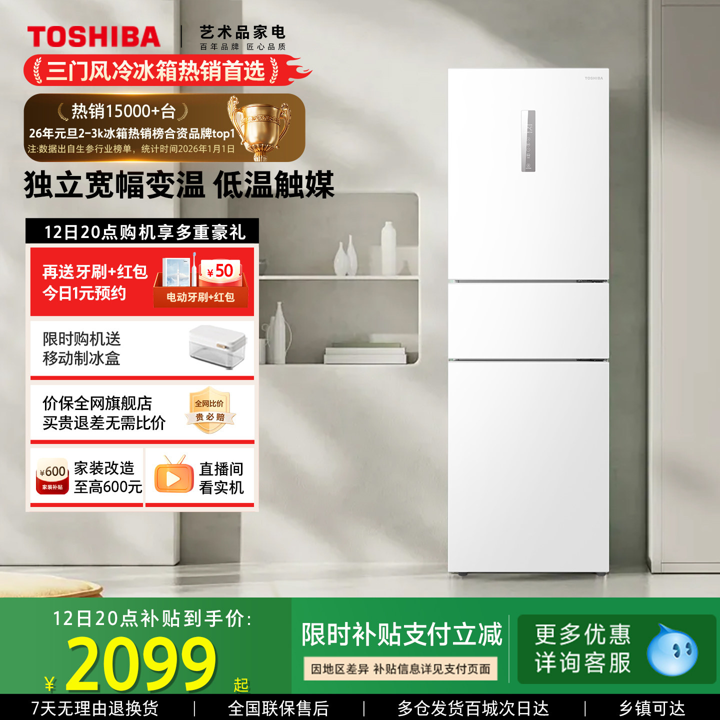东芝小小白285三门一级能效风冷无霜变频家用小户型冰箱以旧换新