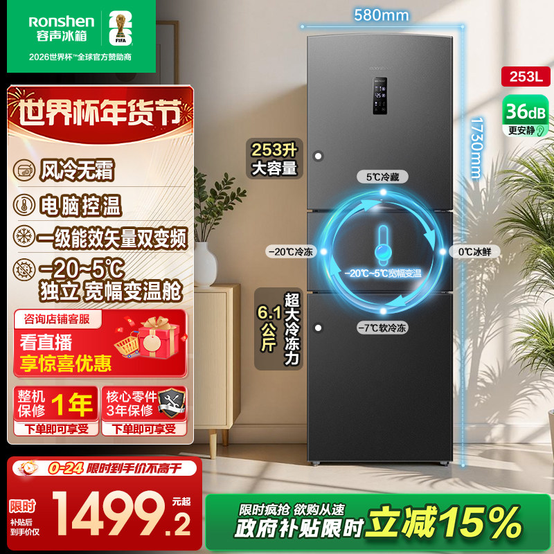 容声253L三开门变频风冷无霜一级节能家用超薄小型租房宿舍电冰箱