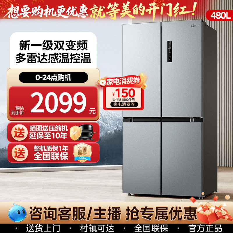 美的480升十字对开双开四门一级能效双变频风冷无霜家用电冰箱