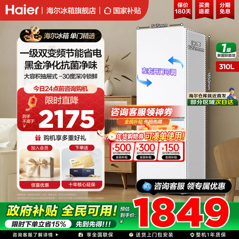 海尔冰箱310升三开门一级能效风冷无霜变频节能小型家用官方正品