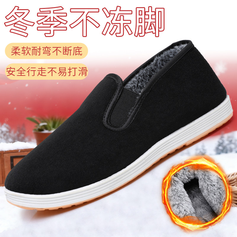 老北京布鞋男士加绒保暖棉鞋一脚蹬加厚防滑耐磨牛筋底青年工作鞋