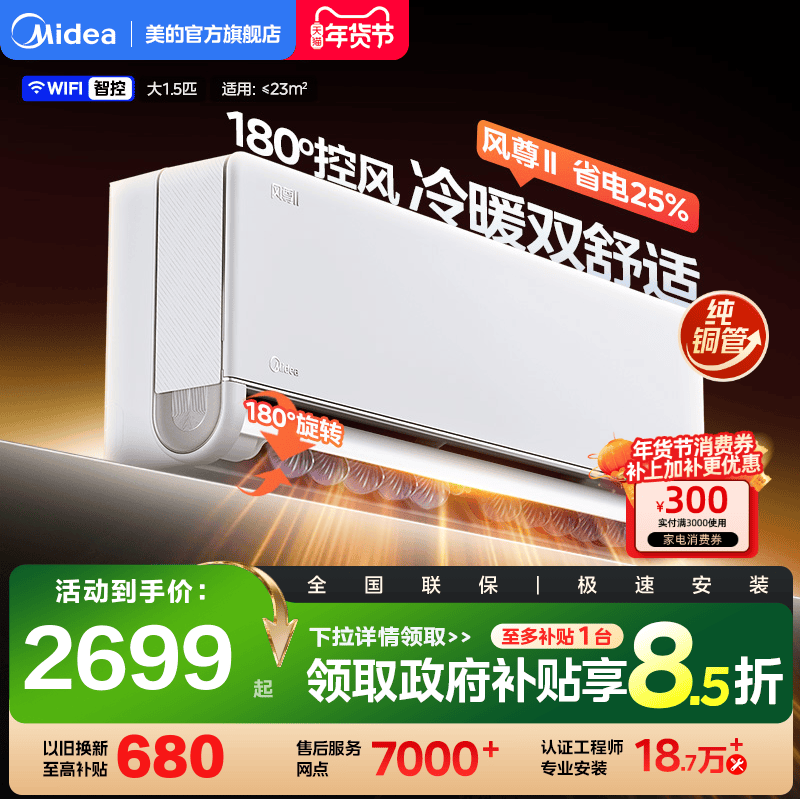 美的空调1.5匹p风尊挂机一级变频冷暖两用家用卧室官方百亿补贴