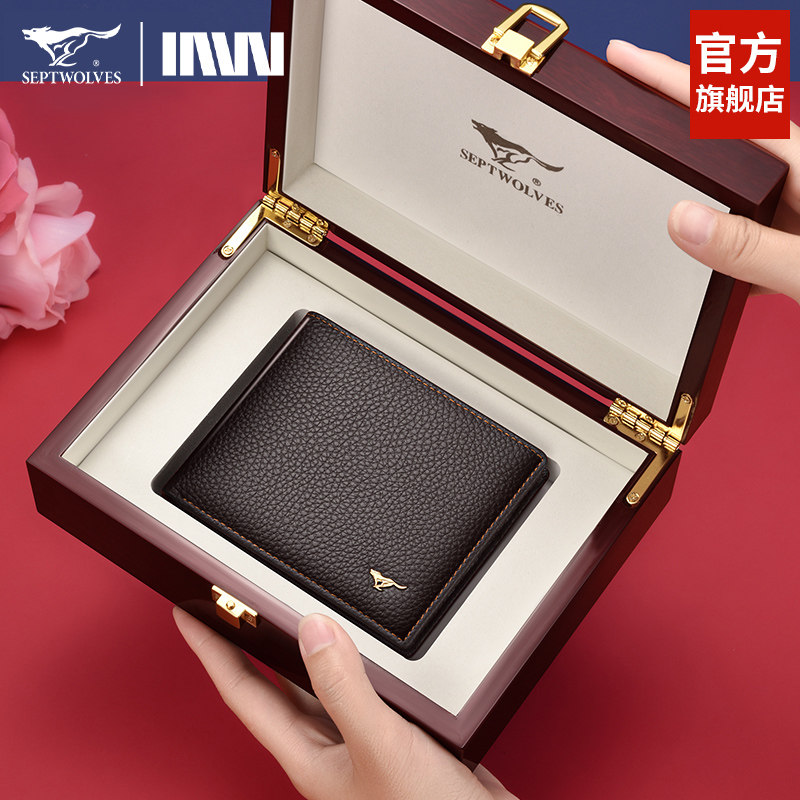 七匹狼钱包男士2026新款真皮短款皮夹生日礼物送爸爸牛皮钱夹礼盒