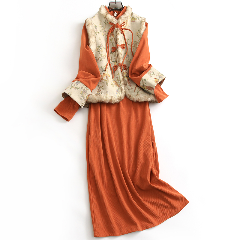 新年穿搭中式国风套装裙毛绒立领改良旗袍裙长袖两件套连衣裙H973
