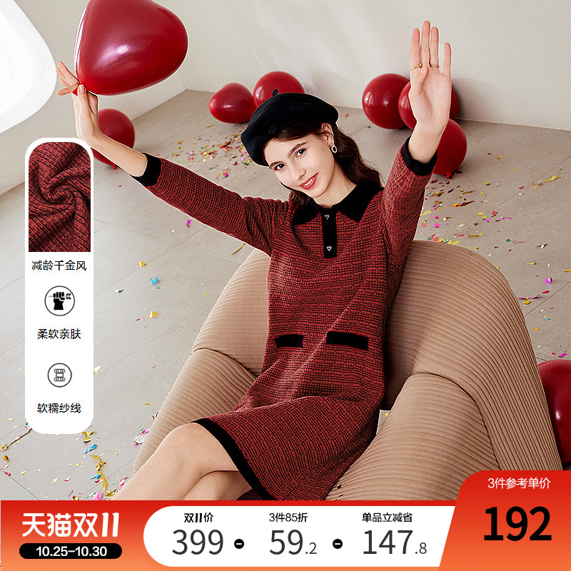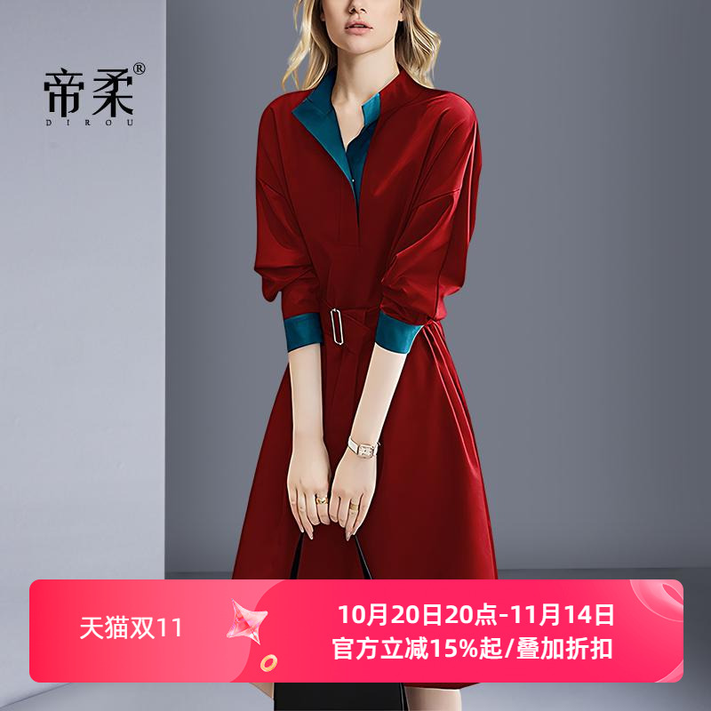 betu百图女装2025年冬季新款新年红色撞色宽松显瘦Polo领连衣裙