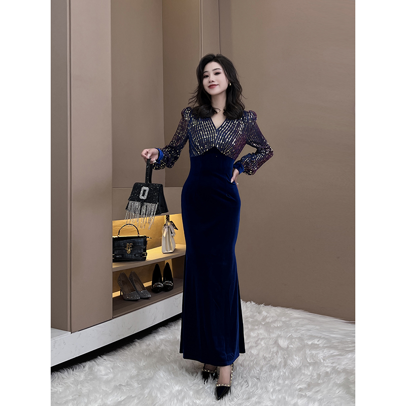 法式复古丝绒裙收腰长款修身包臀礼服裙子鱼尾圣诞新年连衣裙女装