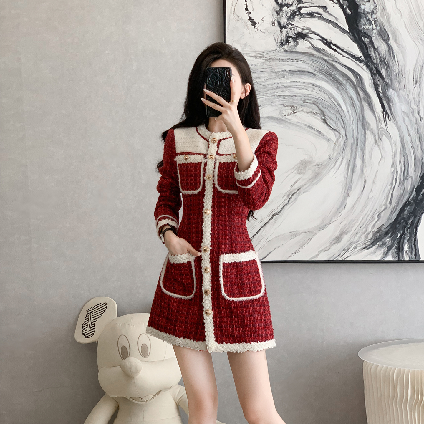 高级感小香风气质时尚连衣裙女秋冬季新年战袍收腰显瘦短裙小个子