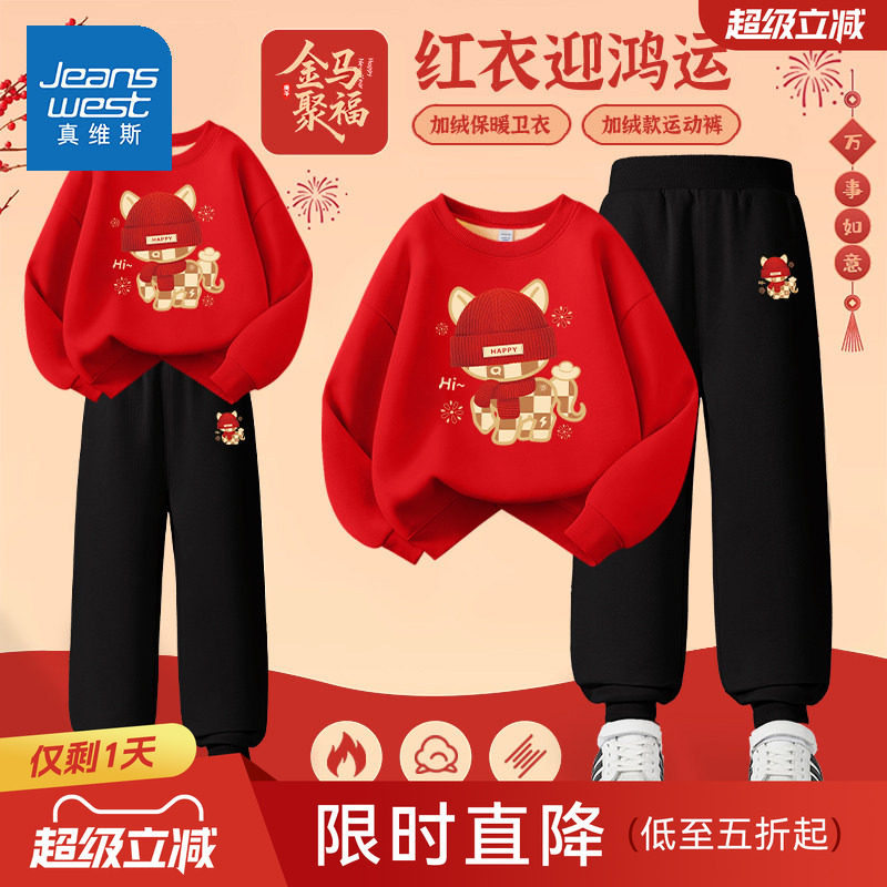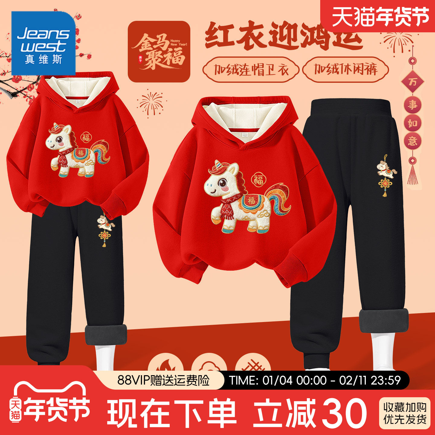 真维斯男童红色卫衣套装过年衣服女童12岁本命新年拜年服儿童冬装