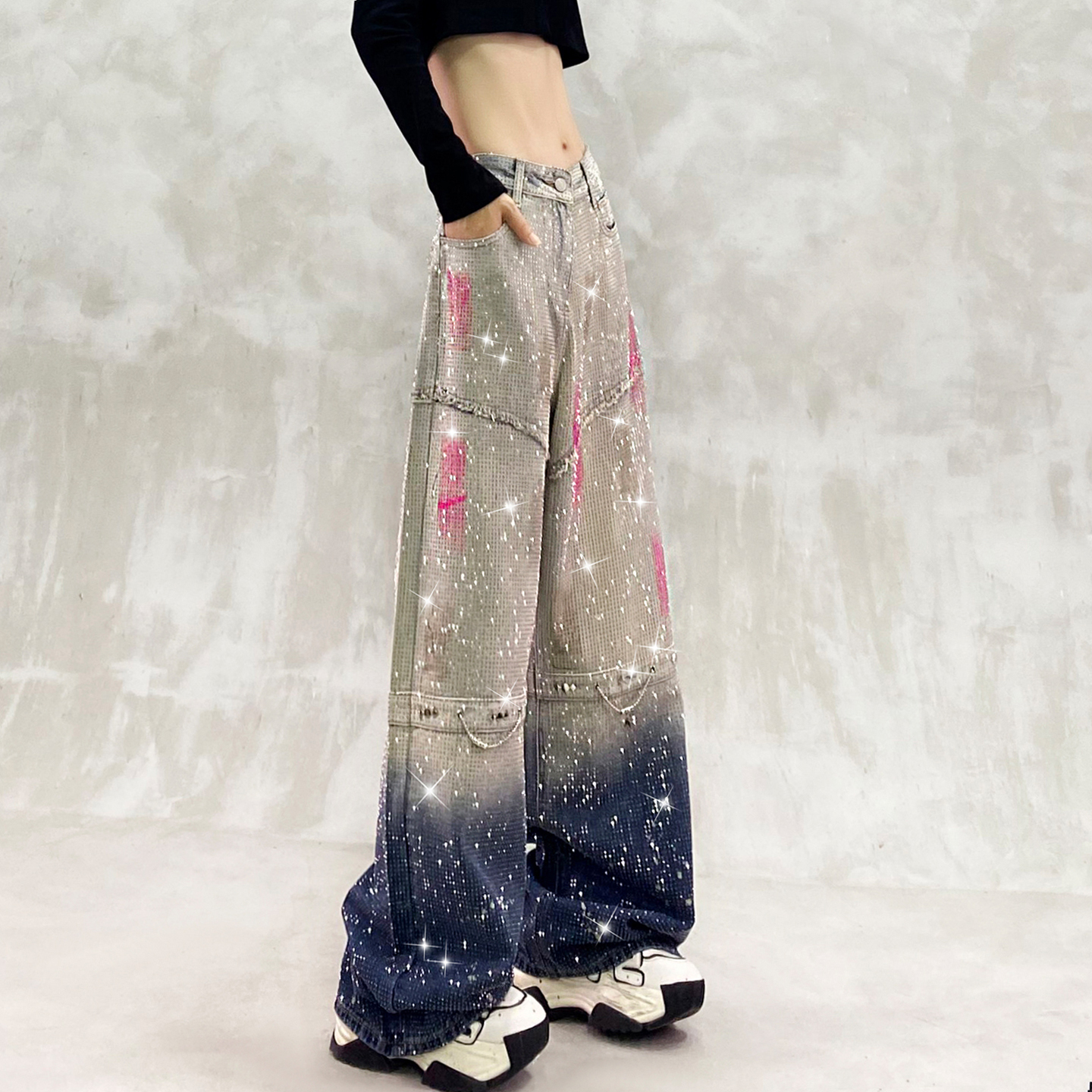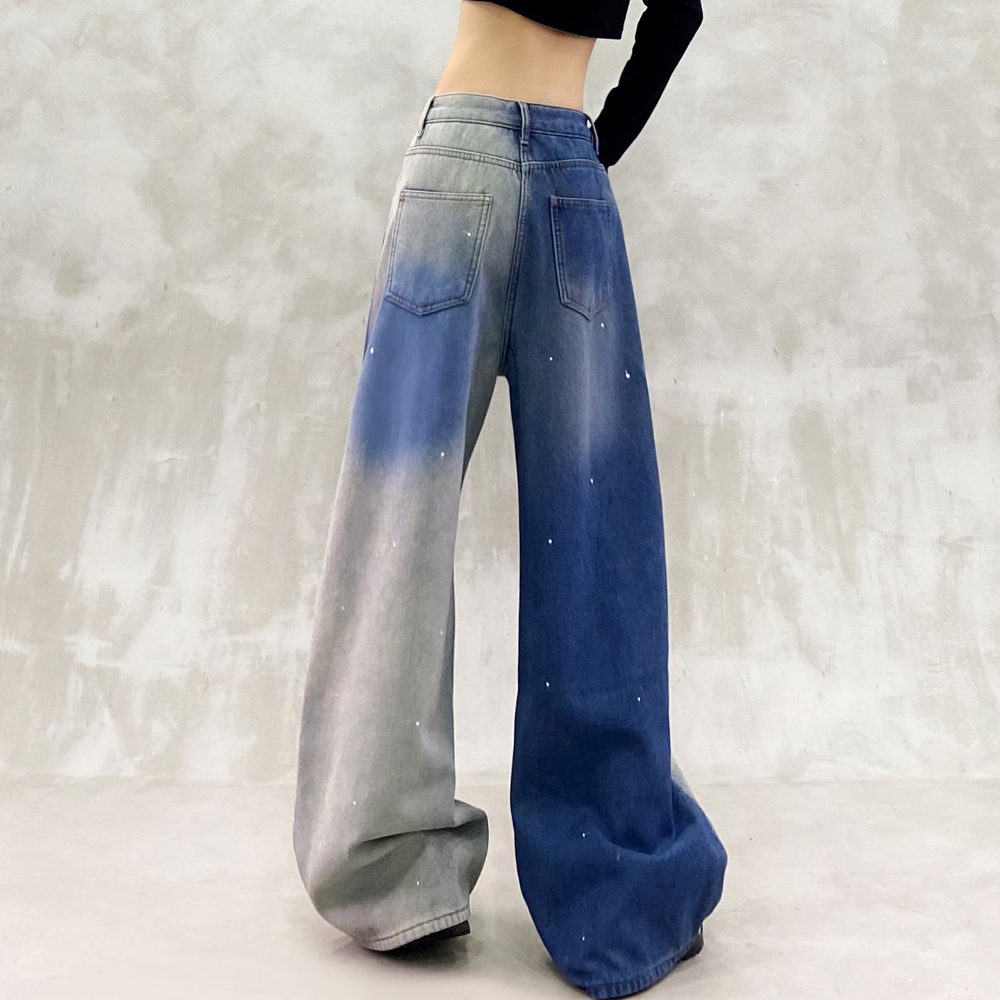 满天星烫钻彩绘渐变色牛仔裤女秋新款高腰宽松显瘦百搭直筒阔腿裤