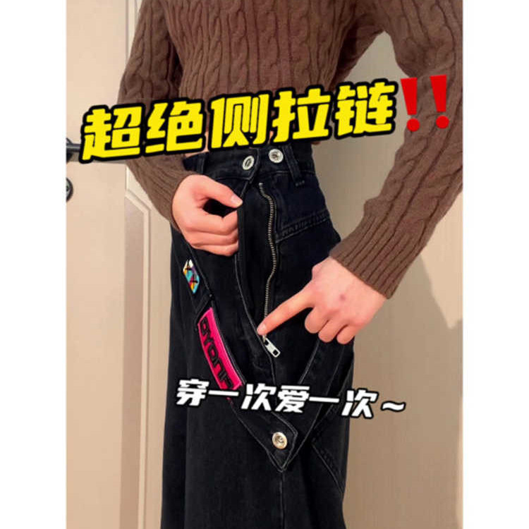 渐变黑灰色侧边拉链阔腿牛仔裤女秋冬季美式复古高街直筒高腰裤子