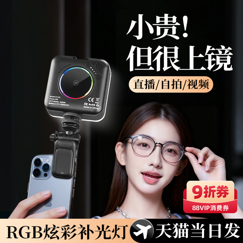 主播补光灯迷你便携式自拍夹手机直播单反相机拍照视频美颜RGB全彩led打光灯手持拍摄神器小型户外豆腐摄影灯