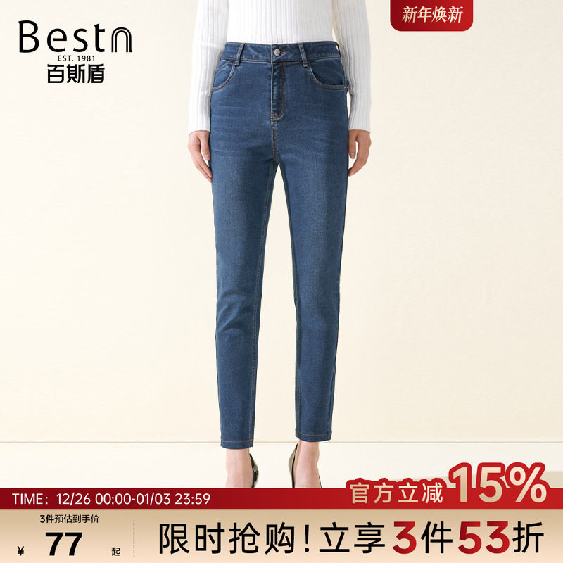 啄木鸟松紧高腰牛仔九分裤女春秋新款小脚铅笔裤弹力小个子长裤女