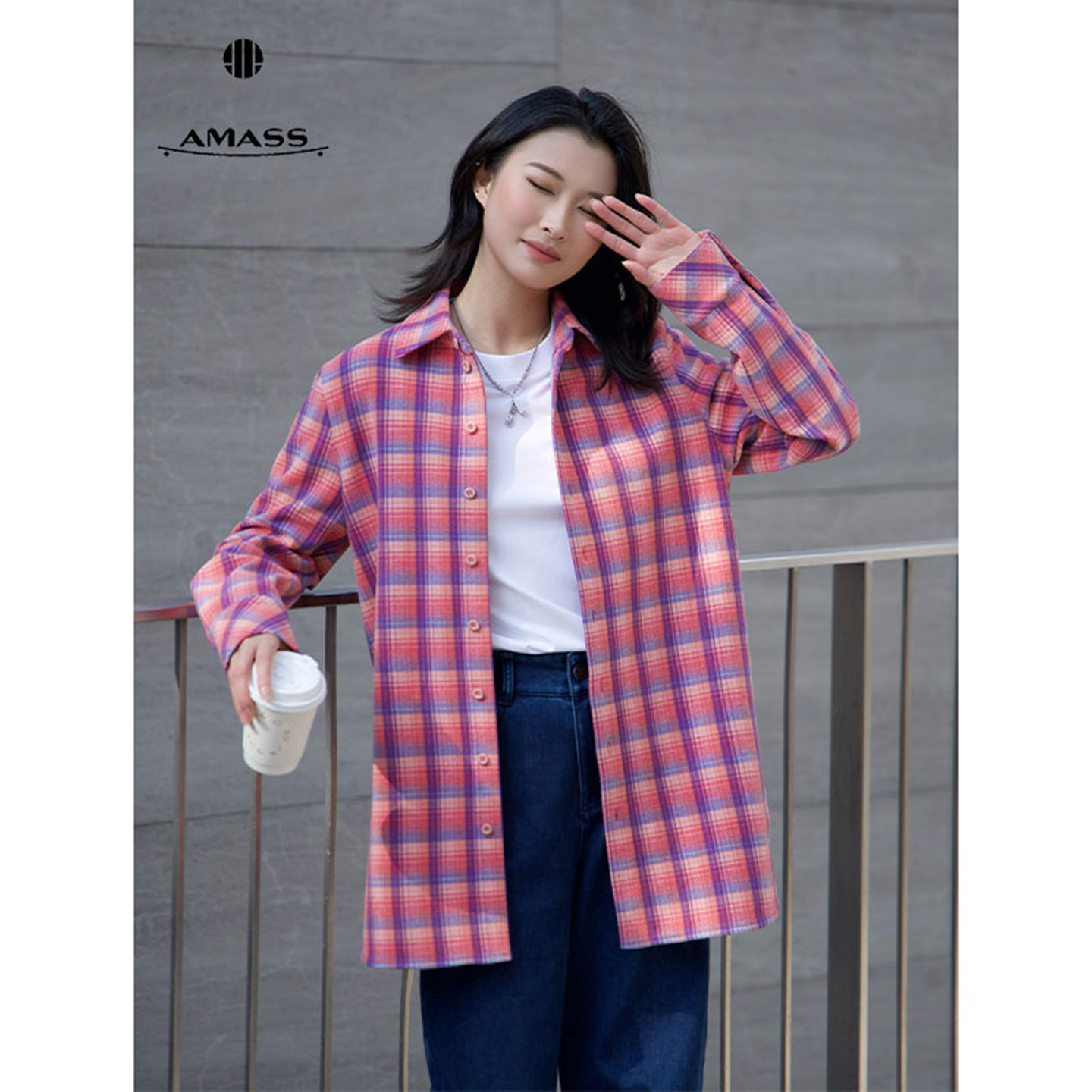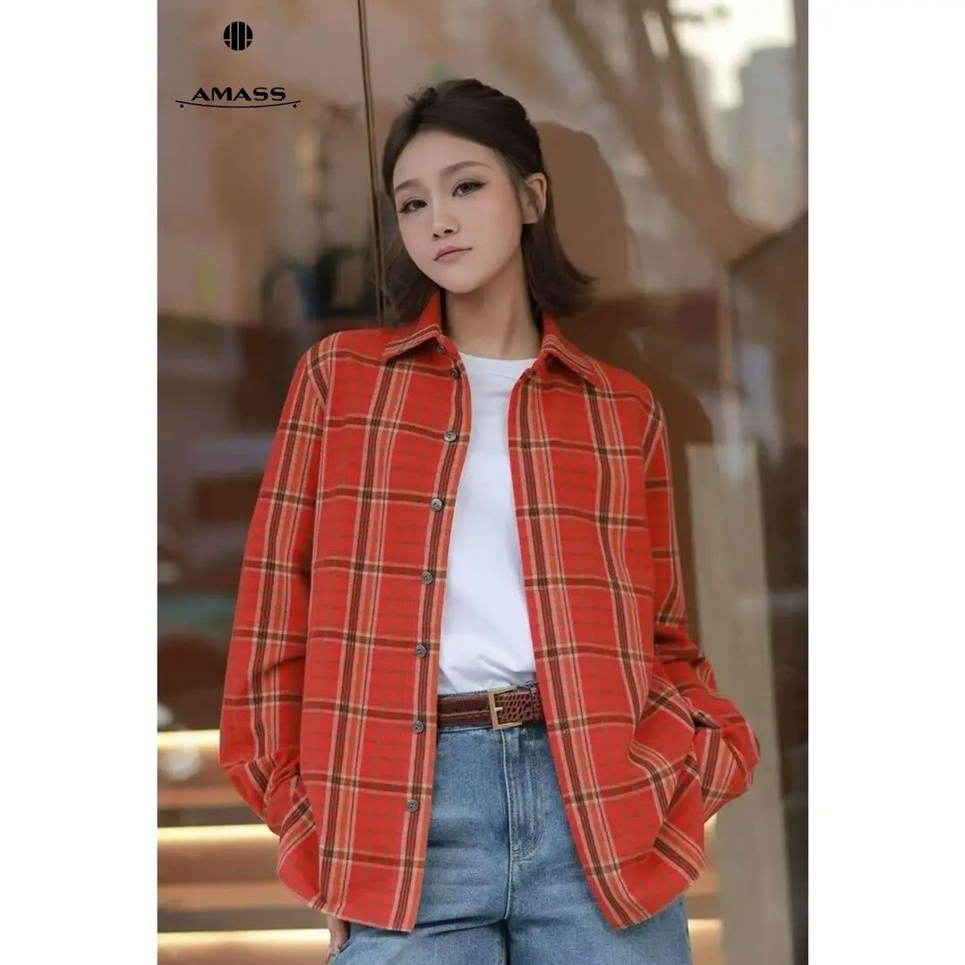 阿玛施AMASS新款减龄复古法式百搭时尚宽松格纹设计感衬衫530107