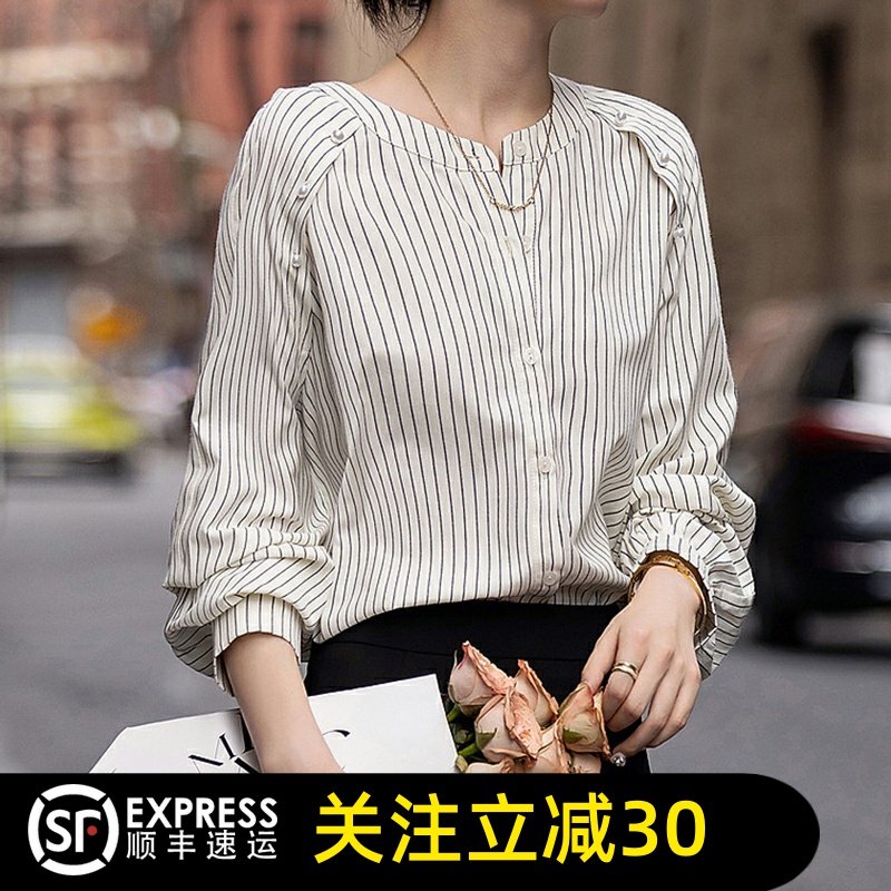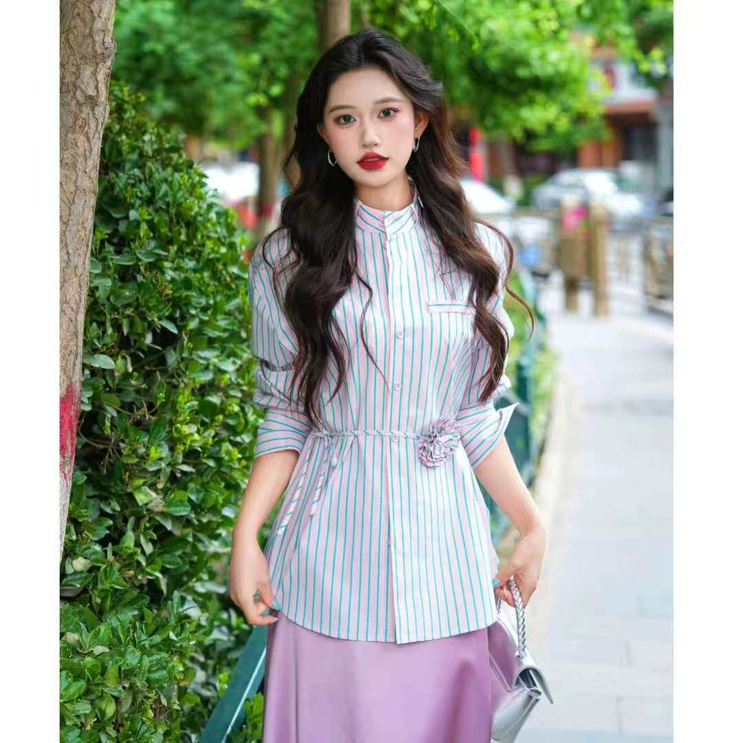 阿玛施女装休闲风立领条纹衬衫女长袖宽松百搭显瘦收腰上衣130050