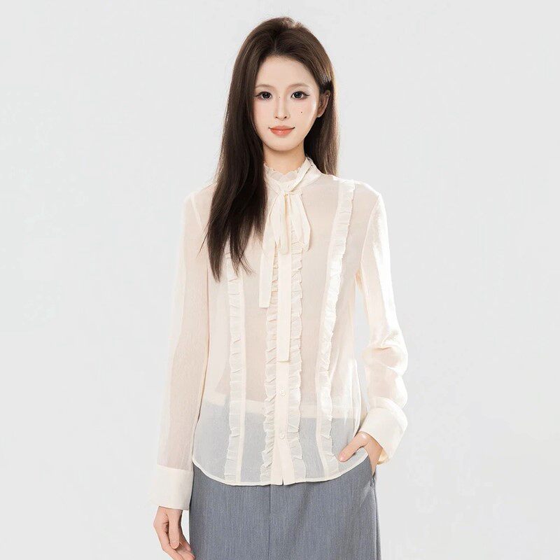 阿玛施女装正品2026春季新款飘带法式气质木耳边网纱长袖衬衫上衣