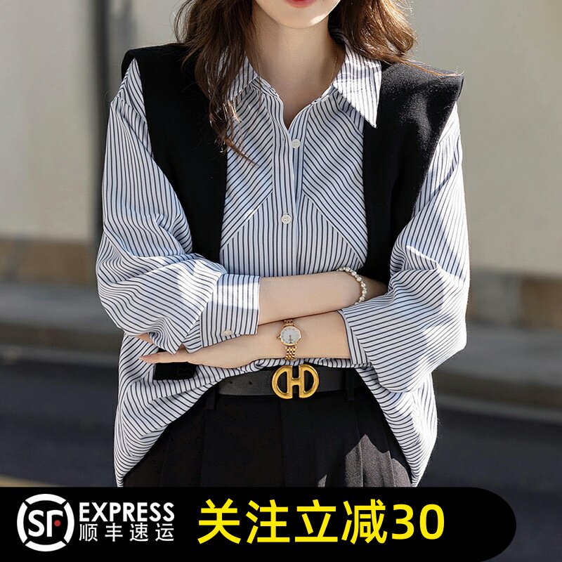 正品哥家2026春新款休闲条纹拼接衬衫宽松长袖上衣显瘦长袖女