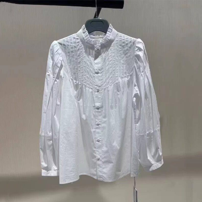 阿玛施女装春法式灯笼袖木耳边衬衫长袖立领套头白色上衣5301033