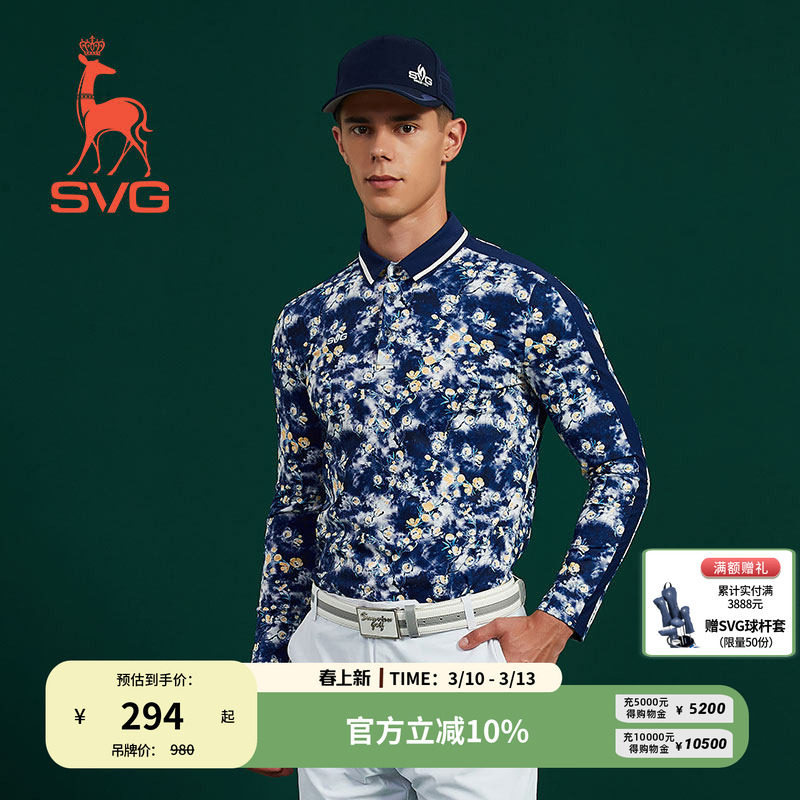 svg高尔夫春季新款男装蓝色扎染印花长袖t恤翻领POLO衫运动上衣男