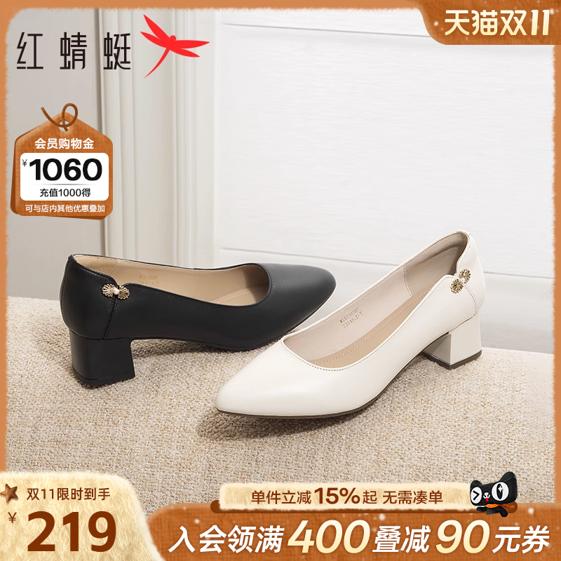红蜻蜓高跟鞋2025新款面试女鞋真皮通勤职业单鞋法式气质粗跟皮鞋