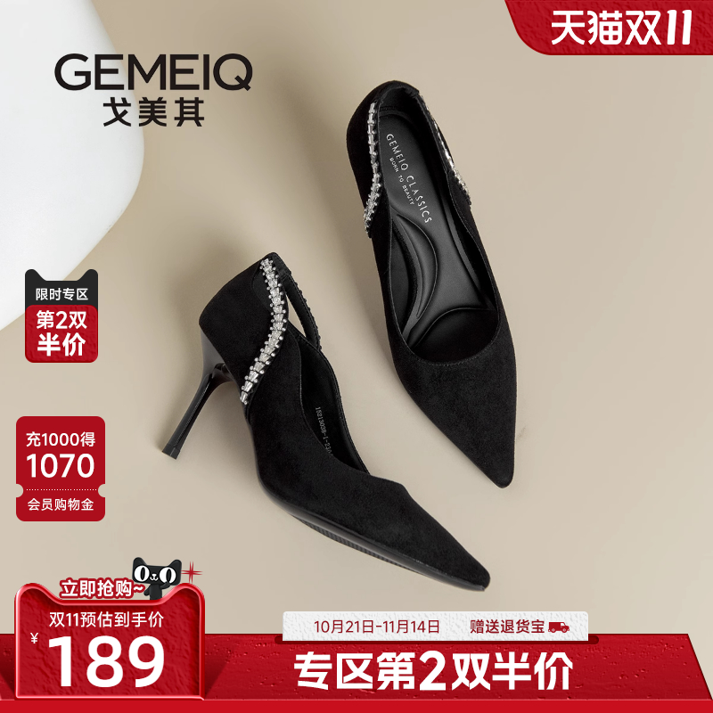 戈美其商场同款黑色高跟鞋女细跟2025新款气质绒面不累脚职业单鞋